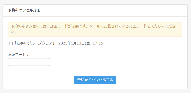 ご予約をキャンセルされる講座のクラス名、日時をご確認いただき、先ほどのメール本文に記載のあった認証コードをコピー&ペーストします。