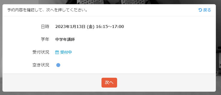 ご予約内容の確認画面です。ご希望の学年、日時について、ご確認ください。