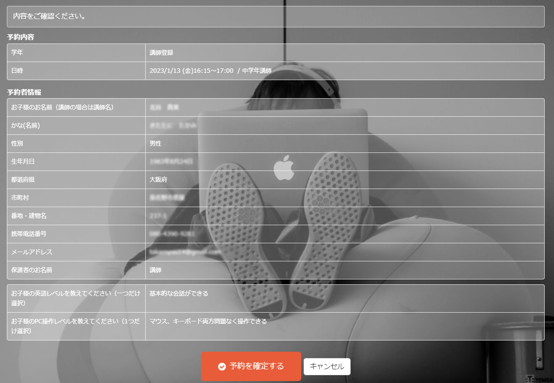 ご予約内容に間違いがなければ、「予約を確定する」ボタンを押してください。
